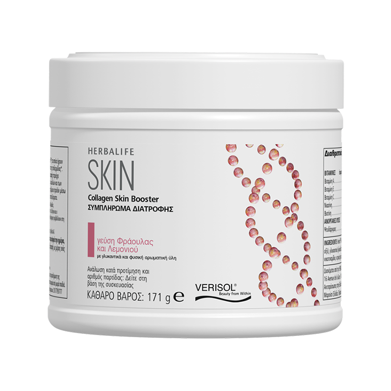 Δοκιμάστε το Collagen Skin Booster! Ένα συμπλήρωμα διατροφής σε μορφή ροφήματος, το οποίο περιέχει σημαντικές βιταμίνες και μέταλλα που συμβάλλουν στην υποστήριξη της υγείας της επιδερμίδας, των μαλλιών και των νυχιών. Περιέχει υψηλής ποιότητας βιοενεργά πεπτίδια κολλαγόνου Verisol® P, τα οποία είναι επιστημονικώς αποδεδειγμένο ότι μειώνουν τις ρυτίδες των ματιών και βελτιώνουν την ελαστικότητα της επιδερμίδας μετά από 4 εβδομάδες.